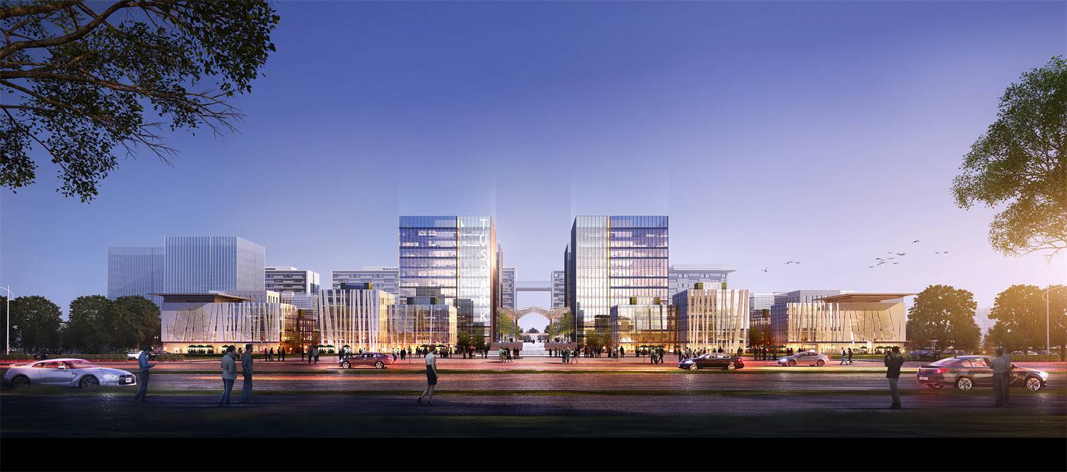 The design of the Tus-Science Park, located in Jeongzhou, follows the design motif of the Tus park in Beijing, with four large towers at the center and smaller buildings surrounding them.