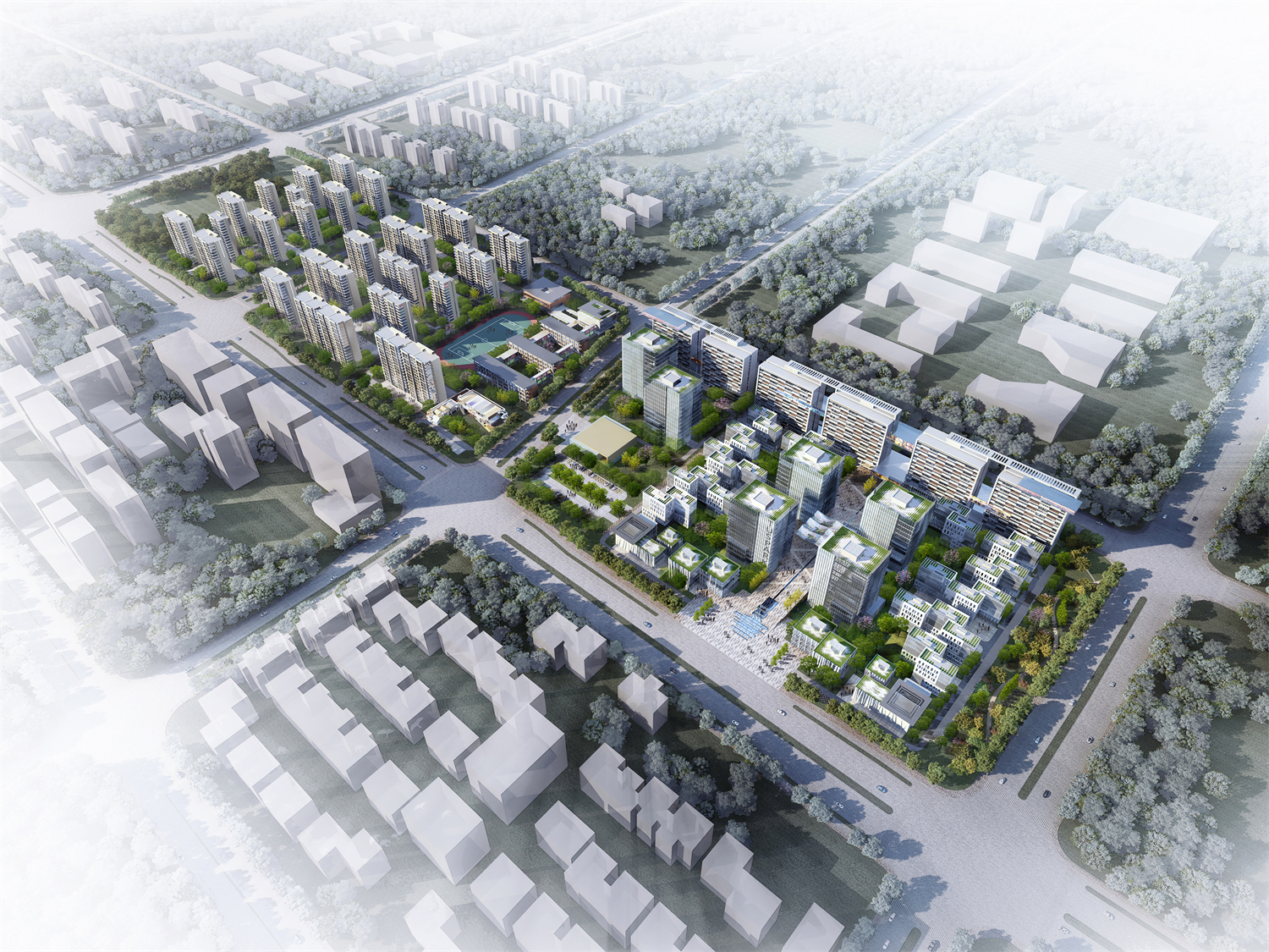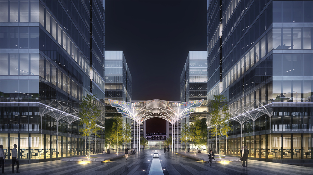 The design of the Tus-Science Park, located in Jeongzhou, follows the design motif of the Tus park in Beijing, with four large towers at the center and smaller buildings surrounding them.